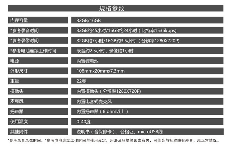 *參考錄音時間、*參考電池工作時間與內存、工作環境等因素有關,可