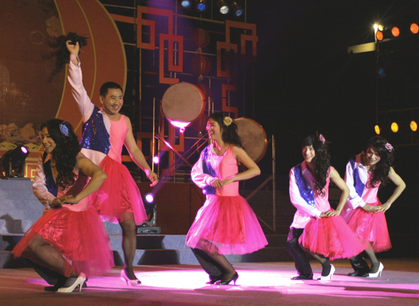 整臺晚會最風趣幽默當屬京華數碼李華、邵天愚表演的相聲《兄弟》和京華尼歐事業部的反串舞蹈《五朵金花》。《兄弟》取材于職工當中,以幽默詼諧、喜聞樂見的相聲形式再現了大家的生產生活和感情世界。耳熟能詳的名字、似曾相識的經歷、引人捧腹的臺詞,引得臺下觀眾陣陣掌聲和笑聲,觀眾們都感嘆到:沒想到我們的日常生活搬到舞臺上竟然這么有意思!隨著串燒音樂的響起,尼歐事業部的“五朵金花”向舞臺款款走來,還沒開始表演,他們的造型就已經逗得臺下觀眾捧腹大笑。四男一女5名演員身體左邊從發型、頭飾、妝容、衣服、鞋襪都為男妝,而右邊卻都為女妝,這種扮相乍一看的確雷人。尤其是看慣了一段柔媚嬌艷的女子舞蹈,突然一個轉身即為雄糾糾氣昂昂的男人舞蹈,一時還真是難以適應,但這正是節目的精華所在。
